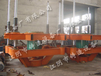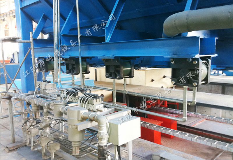 我公司的起模機構使用超大氣缸,四根頂桿固定在同一缸體上,而達到同步目的。一般我公司的起模機構、頂桿直徑超過120毫米,調質加工后鍍鉻、磨光處理。我公司的起模機構一般可頂起10~30噸左右的砂箱,起模機構的壽命可以說是無限的;