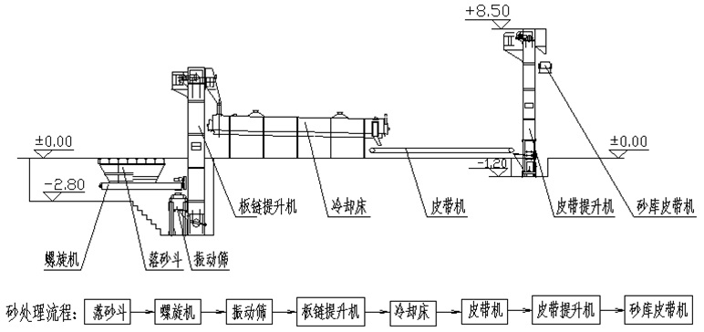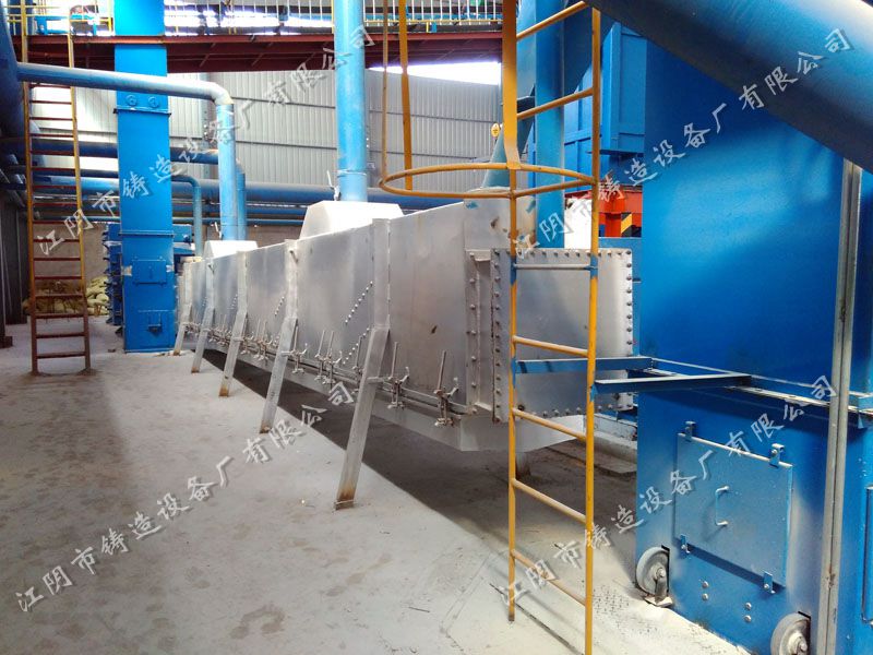 當高溫型砂(局部可達500℃以上)進入冷卻床后,將型砂有效冷卻至滿足工藝要求后( 50~55℃ ),經皮帶輸送機、斗式提升機、皮帶輸送機,卸至砂斗,待用。