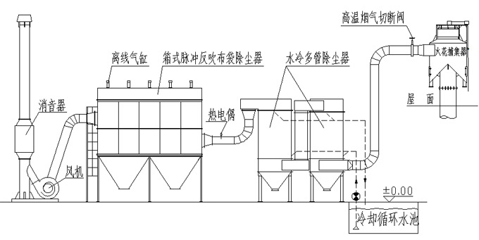 沖天爐的除塵有別于其他設備的除塵,沖天爐的煙氣溫度,低的時候100℃都不到,高的時候700—800℃,甚至近千度,這就要求除塵系統必須具備廣泛的適應能力,因此必須配備強有力的煙氣冷卻設備。我公司根據沖天爐大小配備合適的兩臺水冷多管除塵器,其冷卻面積達到400—500m2,能確保高溫煙氣經水冷多管除塵器冷卻后,煙氣溫度在布袋的可承受范圍內(低于100℃)。且經過水冷多管除塵器,能將顆粒大的,有燃燒可能的焦炭粒沉降下來,更保護布袋的安全。